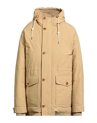 parka, shell, solid color, embroidered logo, hooded, single-breasted , long sleeves, goose down interior, zipper fastening, button fastenings, drawstring waist, flap pocket, contains non-textile parts of animal origin, machine wash, do not bleach, tumble dry