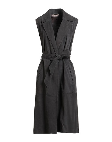 belted coat, suede, solid color, belt, lapel collar, sleeveless, fully lined, belt loops, welt pockets, rear slit, contains non-textile parts of animal origin, dry clean, do not bleach, do not tumble dry
