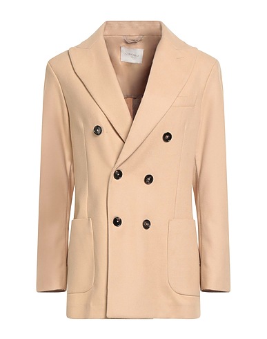 double-breasted coat, wool, no appliqués, solid color, lapel collar, long sleeves, buttoned cuffs, partially lined, button fastenings, patch pockets, side splits, dry clean, do not bleach, do not tumble dry