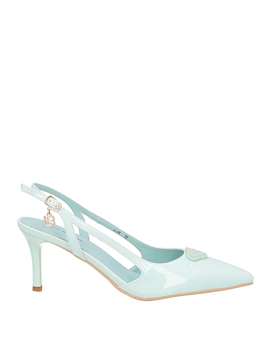 coated fabric, varnished effect, brand logo, solid color, fully lined, buckle fastening, narrow toeline, stiletto heel, rubber sole, slingback pumps