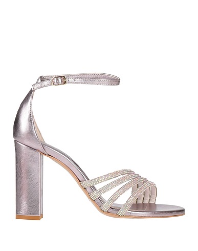 ankle strap sandals, leather, metallic, solid color with appliqués, crystals, leather lining, buckle-fastening ankle strap, round toe, square heel, rubber sole, contains non-textile parts of animal origin