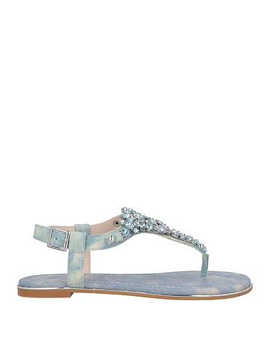 ankle strap thong sandals, denim, tie-dyed, crystals, fabric inner, buckle fastening, round toe, flat, rubber cleated sole