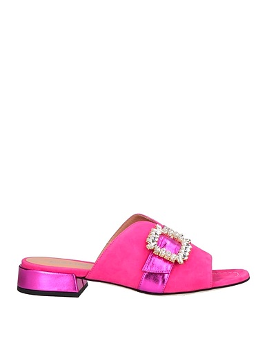 slide sandals, suede, metallic, embellished, solid color with appliqués, leather lining, round toe, square heel, covered heel, leather sole, contains non-textile parts of animal origin