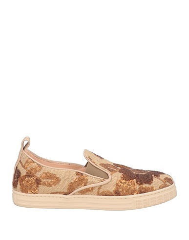slip on, string, leather, floral-print, sequins, brand logo, leather lining, elasticized inserts, round toe, rubber cleated sole, contains non-textile parts of animal origin