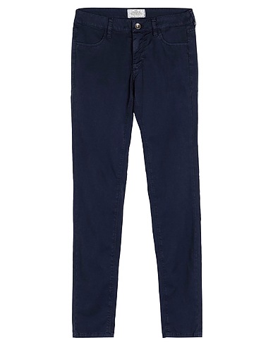 plain weave, brand logo, solid color, low waisted, tapered leg, slim-leg pants, zipper closure, 1 button, multipockets, stretch, pants