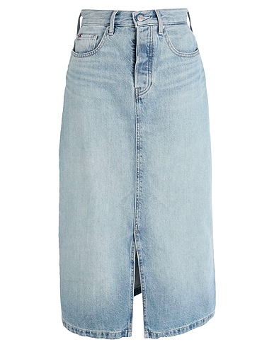 denim, faded, brand logo, leather trims, solid color, light wash, belt loops, 1 button, zipper fastening, front slit, multipockets, machine wash, do not bleach, contains non-textile parts of animal origin, flared skirt
