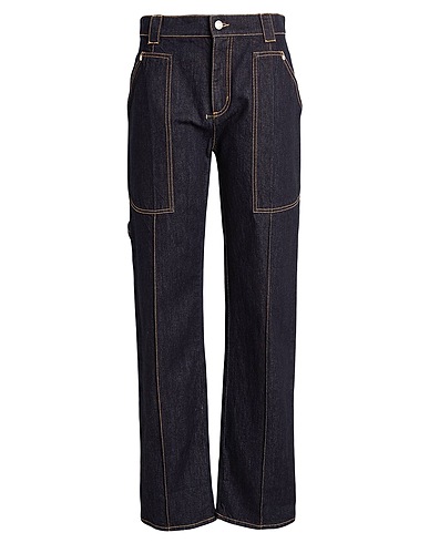 straight-leg jeans, denim, brand logo, leather trims, solid color, dark wash, high waisted, regular fit, 1 button, zipper fastening, multipockets, dry clean, do not bleach, do not tumble dry, contains non-textile parts of animal origin