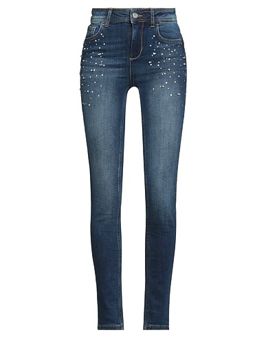 tapered jeans, denim, faded, solid color with appliqués, crystals, brand logo, medium wash, mid rise, slim fit, zipper fastening, 1 button, multipockets, stretch, machine wash, do not bleach, do not tumble dry
