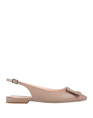 slingback ballet flats, leather, solid color with appliqués, embellished, brand logo, leather lining, buckle fastening, pointed toe, flat, rubber cleated sole, contains non-textile parts of animal origin