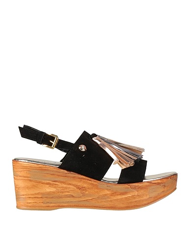 slingback sandals, suede, solid color with appliqués, tassels, metallic trim, buckle fastening, round toe, wedge, rubber sole, lined interior, contains non-textile parts of animal origin