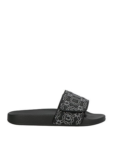 pool slides, synthetic material, two-tone, embroidered, brand logo, rubber lining, round toe, flat, rubber cleated sole, planning a weekend getaway or beach vacation? this is the effortless summer style you need