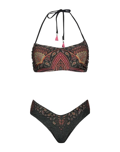 synthetic jersey, metallic, paisley-print, brand logo, tassels, tie fastening, fully lined, removable padding, no underwire bra, machine wash or dry clean, do not bleach, do not tumble dry