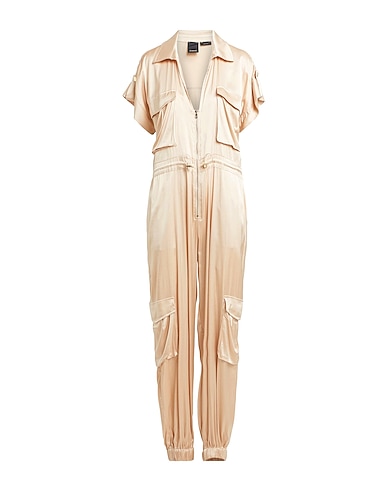 satin, brand logo, solid color, v-neck, short sleeves, zipper fastening, multipockets, stretch