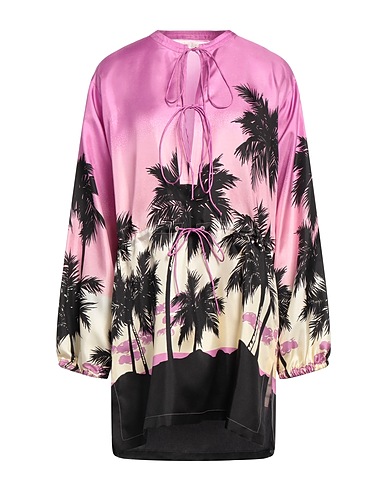 bow blouse, satin, no appliqués, hawaiian-print, bow-tie neckline, long sleeves, drawstring closure, no pockets