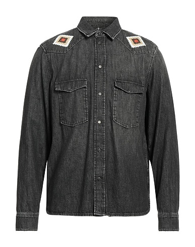 denim, faded, embroidered detailing, solid colour with appliqués, coloured wash, classic collar, long sleeves, snap button cuffs, snap buttons fastening, two breast pockets