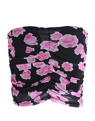 bandeau top, tulle, floral-print, gathered, draped, deep neckline, fully lined, stretch