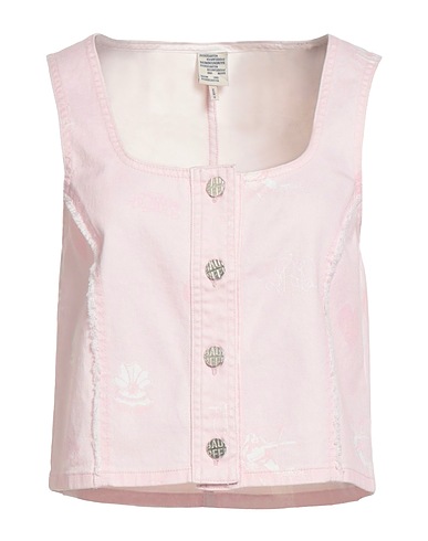top, denim, stretchy fabric, cartoon print, brand logo, square neckline, sleeveless, button fastenings, machine wash or dry clean, do not tumble dry