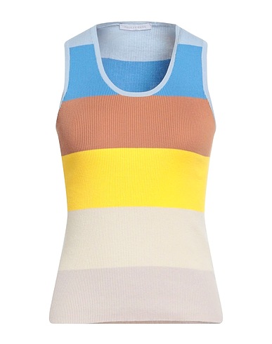 top, knitted, lightweight knit, striped, no appliqués, crewneck, sleeveless, hand wash or dry clean, do not bleach, do not tumble dry