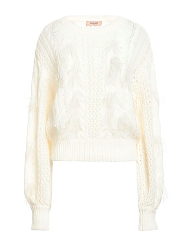 cable-knit, medium-weight knit, feathers, brand logo, plain colour with appliqués, crewneck, long sleeves, contains non-textile parts of animal origin, dry clean, do not bleach, do not tumble dry