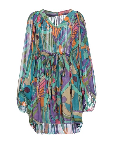 crepe, laces, frills, multicolour pattern, v-neck, long sleeves, no pockets, rear closure, snap buttons fastening, fully lined