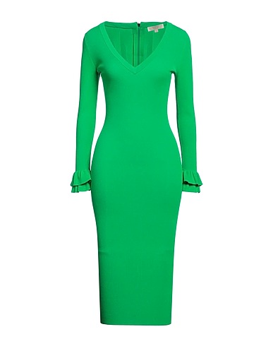 bodycon dress, knitted, ribbed, lightweight knit, stretchy fabric, plain colour, ruffles, v-neck, long sleeves, unlined, zip fastening