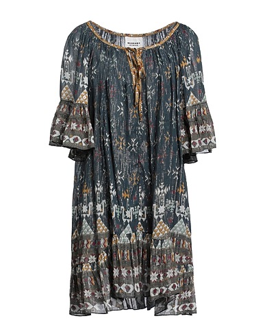 plain weave, lamé, frills, geometric design, crewneck, short sleeves, bell sleeves, fully lined, self-tie closure, no pockets, trapeze style