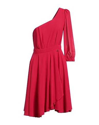 crepe, brand logo, plain colour, scoop neckline, one-shoulder, fully lined, zip fastening, without pockets, flared dress