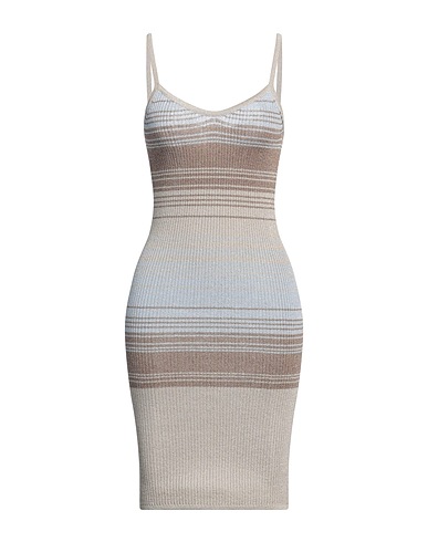 bodycon dress, knitted, metallic, lightweight knit, striped, no appliqués, deep neckline, sleeveless, unlined, machine wash or dry clean, do not bleach, do not tumble dry