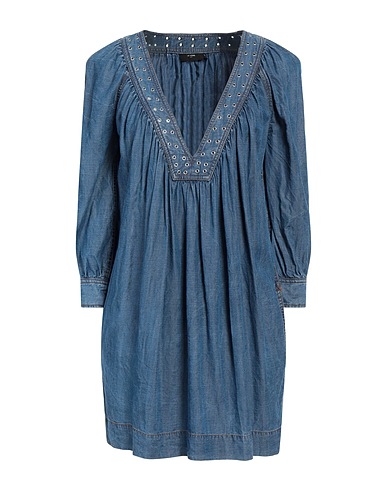 dress, denim, plain colour with appliqués, studs, gathered, deep neckline, long sleeves, buttoned cuffs, unlined, multipockets, machine wash or dry clean, do not bleach, tumble dry