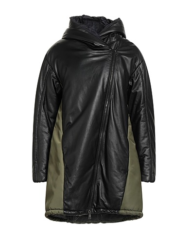 single-breasted coat, leather, shell, no appliqués, two-tone, hooded, long sleeves, goose down interior, lightweight padding, zip fastening, multipockets, contains non-textile parts of animal origin, do not wash, do not bleach, do not tumble dry