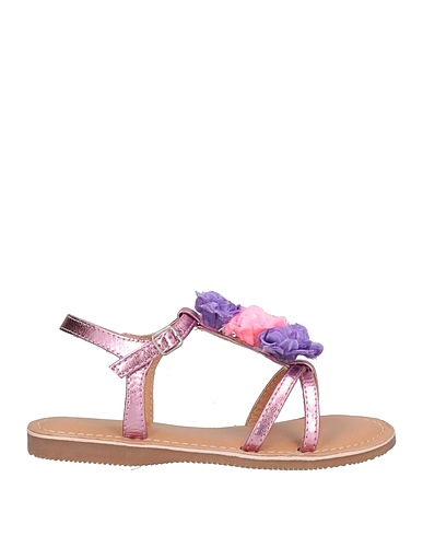 leather, laminated effect, flower application, solid colour, leather backing, wrapping straps closure, round toeline, flat, rubber cleated sole, contains non-textile parts of animal origin, ankle strap sandal