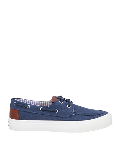 boat shoes, synthetic material, canvas, two-tone, brand logo, fabric inner, lace-up, round toe, flat, rubber cleated sole