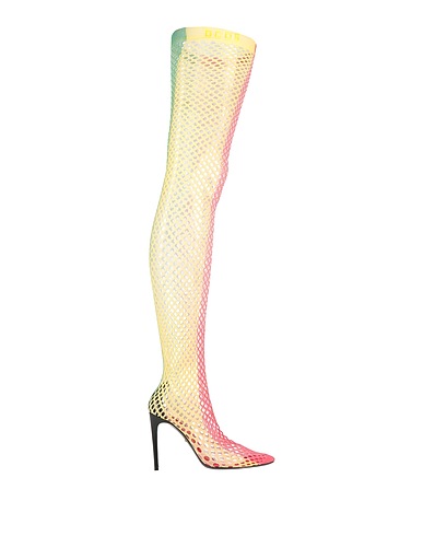 mesh fabric, brand logo, multicolour pattern, fabric inner, narrow toeline, stiletto heel, leather sole, contains non-textile parts of animal origin, over-the-knee boots model