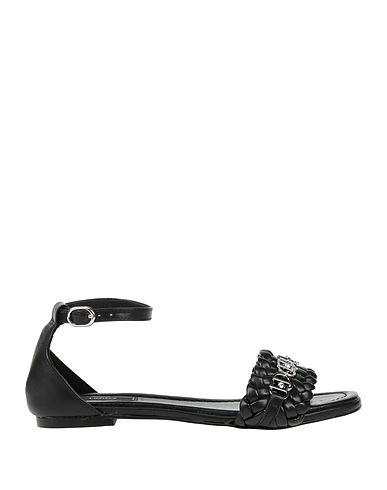 ankle strap sandals, leather, plain colour with appliqués, brand logo, leather lining, buckle fastening, round toe, flat, leather sole, contains non-textile parts of animal origin