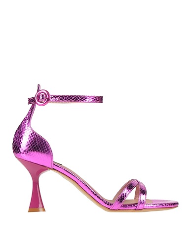 coated fabric, laminated effect, no appliqués, plain colour, leather backing, buckling ankle strap closure, round toeline, geometric heel, covered heel, rubber sole, contains non-textile parts of animal origin, ankle strap sandal