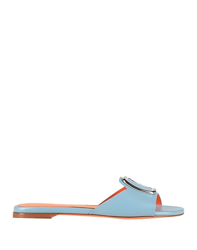 slide sandals, leather, plain colour with appliqués, brand logo, leather lining, round toe, flat, leather sole, contains non-textile parts of animal origin, large sized