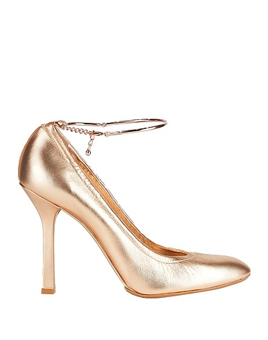pumps, leather, metallic, plain colour with appliqués, detachable application, crystals, leather lining, ties at ankle, round toe, geometric heel, covered heel, leather sole, contains non-textile parts of animal origin