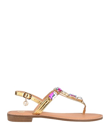 ankle strap thong sandals, synthetic material, metallic, plain colour with appliqués, crystals, leather lining, buckle fastening, round toe, flat, sole in eco-leather, contains non-textile parts of animal origin