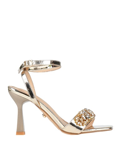 coated fabric, metallic, crystals, plain colour with appliqués, lined interior, buckle-fastening ankle strap, square toe, spool heel, rubber sole, ankle strap sandals