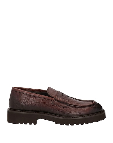 pebbled-leather, no appliqués, two-tone, leather lining, round toe, square heel, rubber cleated sole, contains non-textile parts of animal origin, large sized, penny loafers