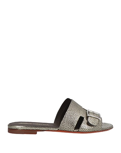 pebbled-leather, metallic, buckle, two-tone, leather lining, round toe, flat, leather/rubber sole, contains non-textile parts of animal origin, slide sandals, large sized