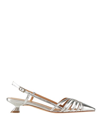 slingback ballet flats, leather, metallic, plain colour, no appliqués, leather lining, buckle fastening, pointed toe, spool heel, leather sole, contains non-textile parts of animal origin