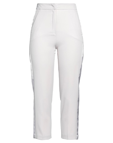 tapered trousers, crepe, stretchy fabric, plain colour, side seam stripes, high waisted, regular fit, zip fastening, hook fastenings, slit pockets, machine wash or dry clean, do not bleach, do not tumble dry, cropped