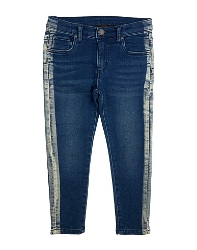 denim, stretchy fabric, two-tone, brand logo, medium wash, tapered leg, 1 button, zip fastening, five pockets, machine wash, do not bleach, do not tumble dry