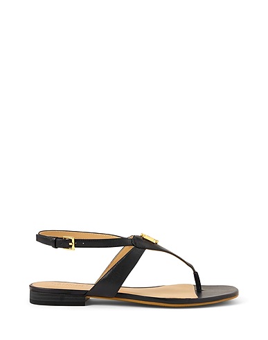toe strap sandals, leather, plain colour, brand logo, leather lining, buckle fastening, round toe, flat, rubber sole, contains non-textile parts of animal origin