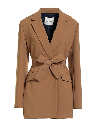 single-breasted blazer, crepe, plain colour, brand logo, belt, lapel collar, long sleeves, fully lined, flap pocket, rear slit, stretch, dry clean, do not bleach, do not tumble dry