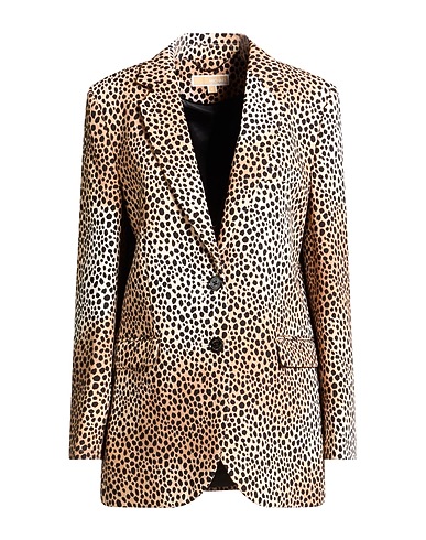 single-breasted blazer, crepe, stretchy fabric, leopard-print, brand logo, lapel collar, long sleeves, shoulder pads, fully lined, button fastenings, flap pockets, one chest pocket, dry clean, do not bleach, do not tumble dry