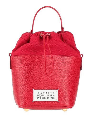 bucket bag, pebbled-leather, canvas, plain colour, brand logo, drawstring fastening, fully lined, internal pocket, detachable top handle, detachable shoulder strap, metallic straps, feet at base, small size, contains non-textile parts of animal origin