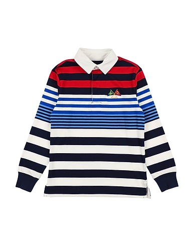 jersey, brand logo, a righe, collo a polo, maniche lunghe, chiusura con bottoni nascosti, senza tasche, fondo con spacchetti laterali, lavare a 30°, lavabile a secco, non candeggiare, asciugare in asciugatrice, stirare a max 150°, questo brand veste grande