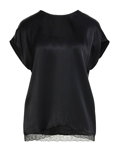 top, raso, tinta unita, brand logo, finiture in pizzo, collo tondo, maniche corte, lavare a secco, non candeggiare, non asciugare in asciugatrice